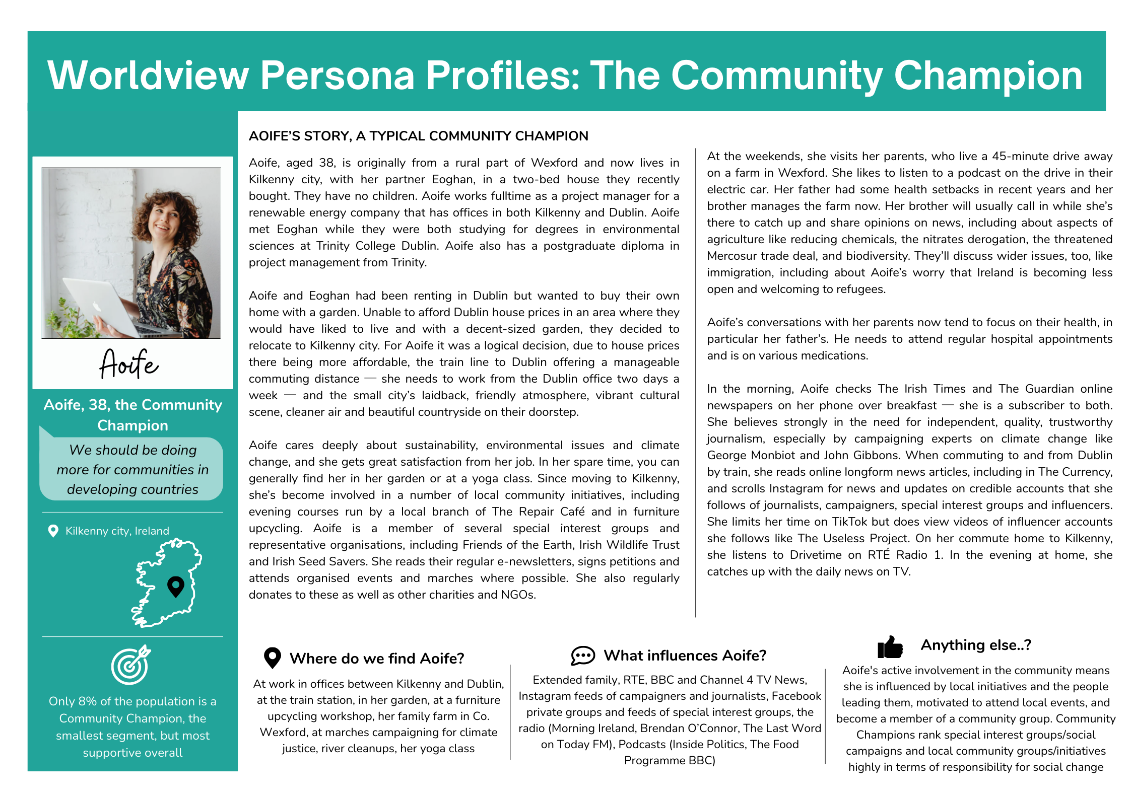 It is important to note that Community Champions, such as Aoife, show greater reliance on special interest groups/representative organisations as sources of influence than other audience segments. They seem to believe that those with specialised understandings are the most reliable topics on specific issues. The fact that Aoife is actively involved in the community suggests that she is also influenced by local initiatives and the people leading them, and motivated to attend local events and join a community group. Indeed, according to the Worldview 2025 findings, in terms of who or what is influential in bringing about social change, Community Champions rank local community groups/initiatives in third place (after government policy in first place and in second place, special interest groups, lobby groups or social campaigns), indicating that they place significant weight on their importance.