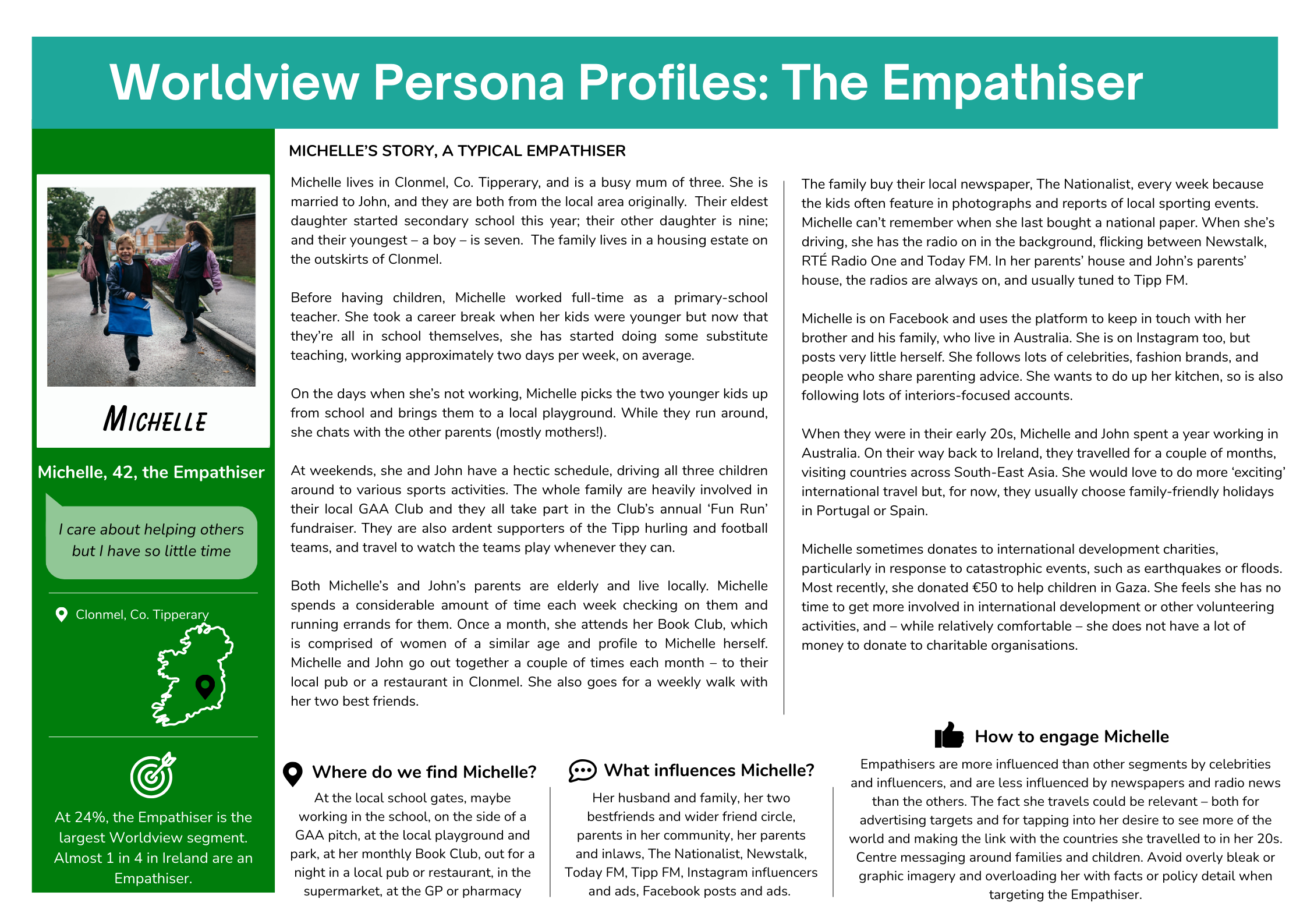 Both Michelle’s and John’s parents are elderly, and live locally. Michelle spends a considerable amount of time each week checking on them and running errands for them. Once a month, she attends her Book Club, which is comprised of women of a similar age and profile to Michelle herself. Michelle and John go out together a couple of times each month – to their local pub or a restaurant in Clonmel. She also goes for a weekly walk with her two best friends.