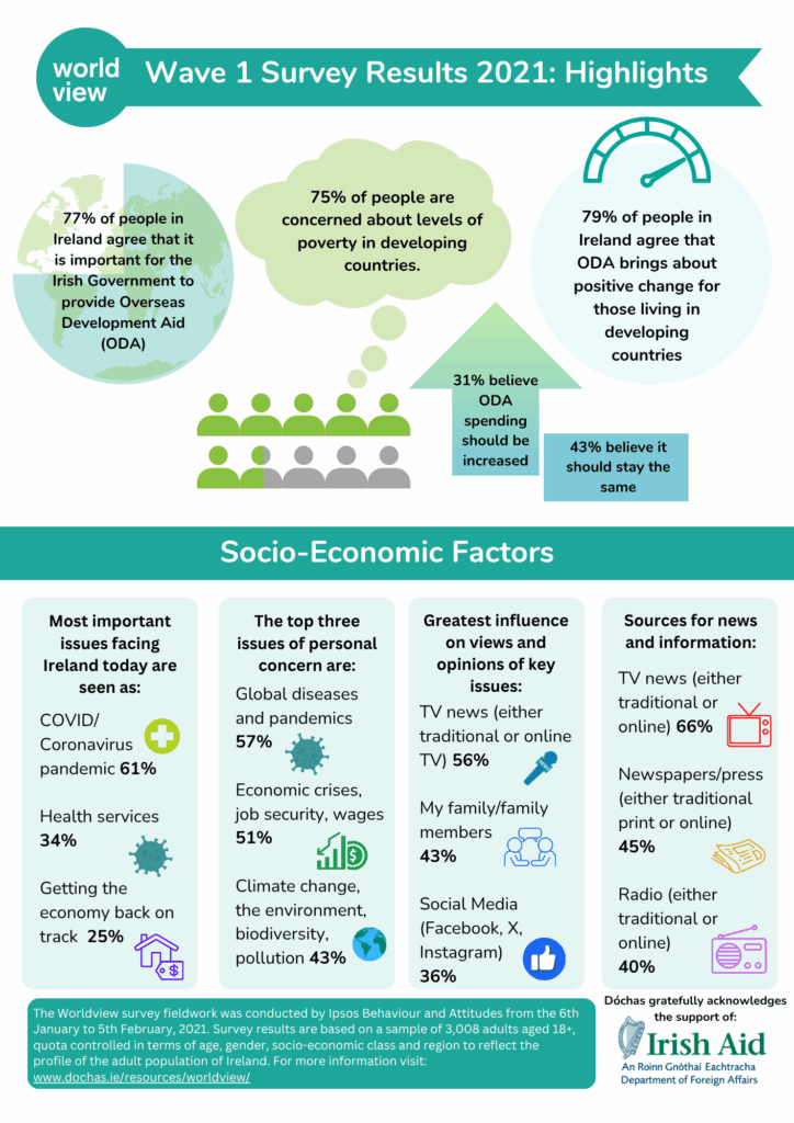 The Worldview Wave 2 survey ran from 20 October – 2 December 2021 among a nationally representative sample of 2,026 Irish adults to gauge their awareness and attitudes towards overseas development aid.