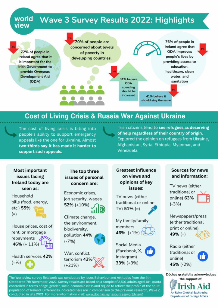 The Worldview Wave 3 survey ran from 4 October – 7 November 2022 among a nationally representative sample of 2,501 Irish adults to gauge their awareness and attitudes towards overseas development aid.