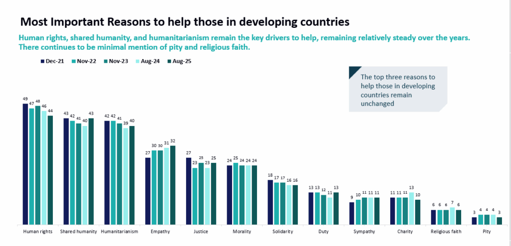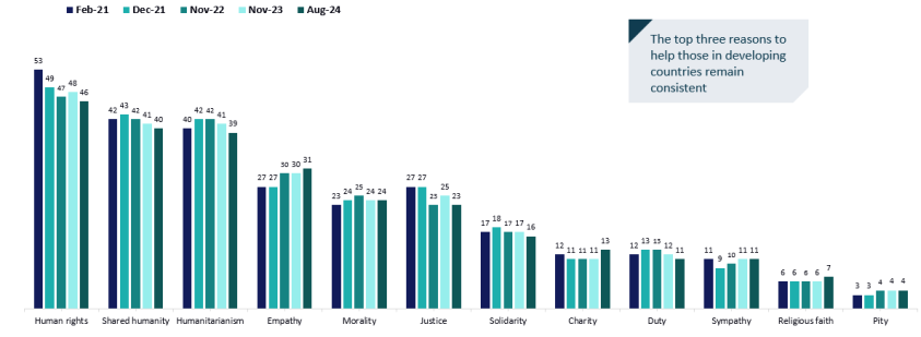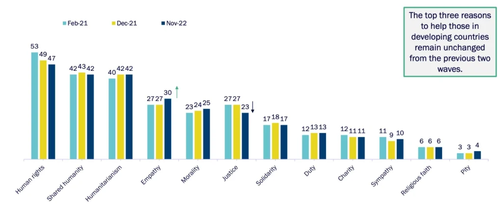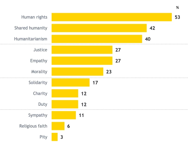 Human rights (53%), shared humanity (42%) and humanitarianism (40%) ranked as the top drivers of individual support for global development while sympathy, religion and pity ranked lowest