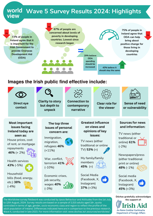 The Worldview Wave 5 survey ran from 1 July – 12 August 2024 among a nationally representative sample of 2,515 Irish adults to gauge their awareness and attitudes towards overseas development aid.