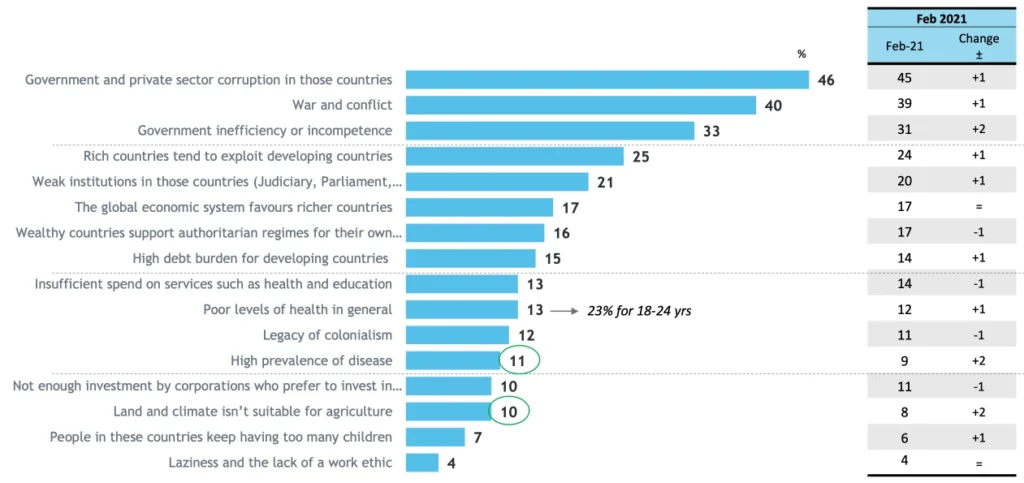 Developing country government and private sector corruption (45%), war and conflict (39%) and government inefficiency and incompetence (31%) ranked highest as the main drivers of global poverty